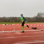 Relativ pünktlich ertönte gegen 14 Uhr der Startschuss für den 10km Hauptlauf. Auf der einführenden Stadionrunde setzte sich bereits ein Teilnehmer von Rest des Feldes ab und zeigte seine Ambitionen, eine Zeit von unter 30 Minuten zu laufen (was ihm am Ende auch gelang). Ich versuchte, ein gleichmäßiges Tempo zu finden und nicht gleich auf den ersten 400 Metern zu überziehen. Schließlich ging es raus aus dem Stadion und nach ein paar asphaltierten Metern folgte eine Brücke, die den einzigen echten Anstieg auf der Runde darstellte. Nach der Brücke war der Weg geschottert und von vielen großen Pfützen übersät. Da ich auf einen Trailschuh setzte, kam ich mit dem Untergrund aber gut zurecht. Nach ca. 2,5km war die erste Runde überstanden, ich reihte mich irgendwo um Rang zehn ein und lief ein relativ konstantes Tempo. Das konnte ich auch auf den weiteren Runden halten, welche insgesamt unspektakulär verliefen. Zuschauer waren wenige an der Strecke und ich war die meiste Zeit allein unterwegs, was den Lauf hauptsächlich zu einer mentalen Prüfung machte.