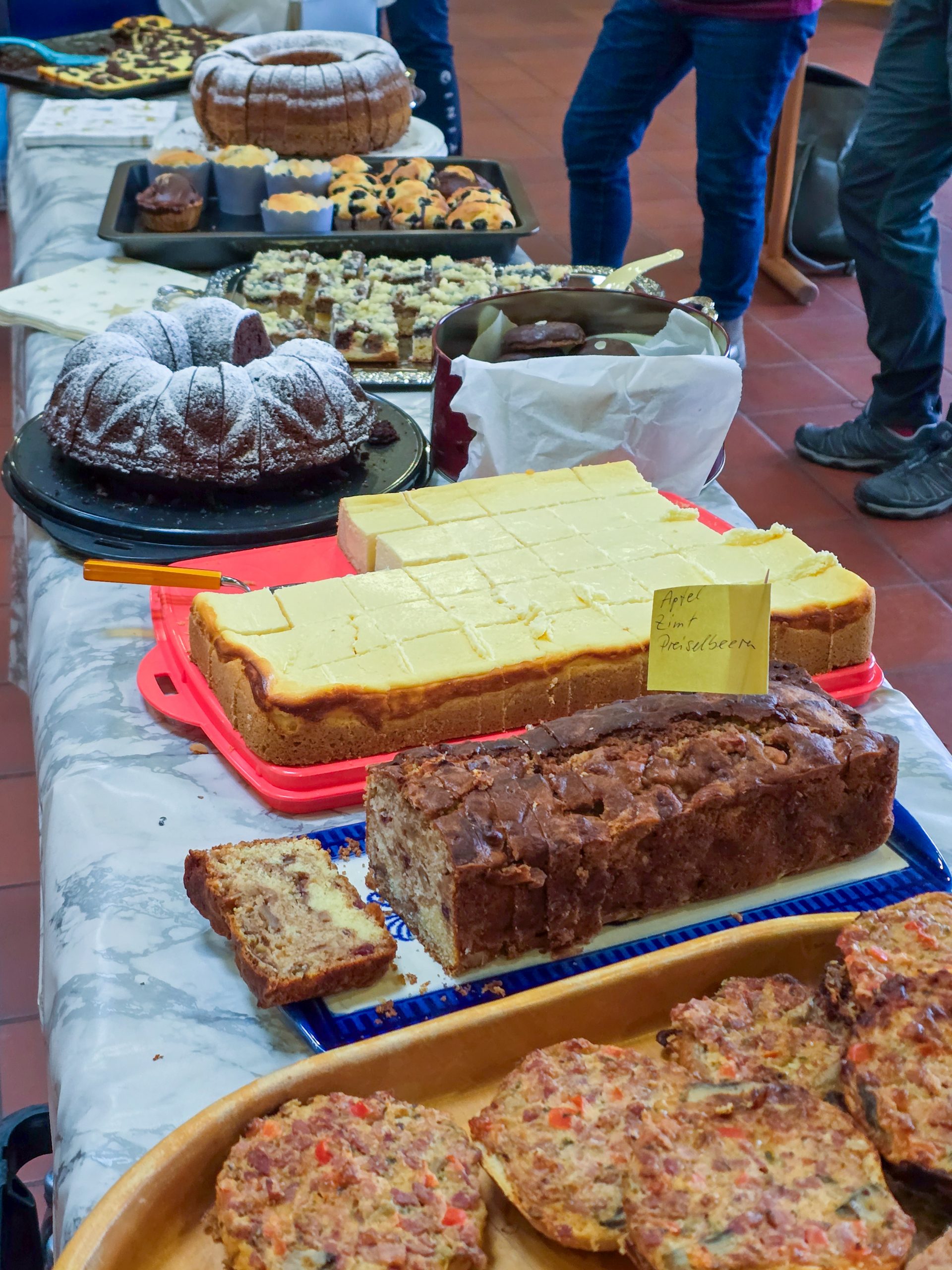 Im Ziel gab es heißen Tee und etwas Kuchen. Ich hielt mich noch etwas auf, wartete auf Claudia und meine Teamkollegen. Nach kurzen Austausch machten wir uns auf den Rückweg ins Tal, auf dem gleichen Weg, den wir nach oben kamen. Unten angekommen, nutzten wir die heißen Duschen, bevor es zum gemütlichen Teil des Tages überging. Denn die echte Zielverpflegung gab es in der Steinachtalhalle. Viele verschiedene Kuchen und andere Leckereien sowie Kaffee und weitere Getränke warteten auf die Teilnehmer. All das wurde von Helfern und Spendern kostenlos zur Verfügung gestellt. Damit verkürzte sich die Wartezeit auf die Siegerehrung natürlich ungemein.