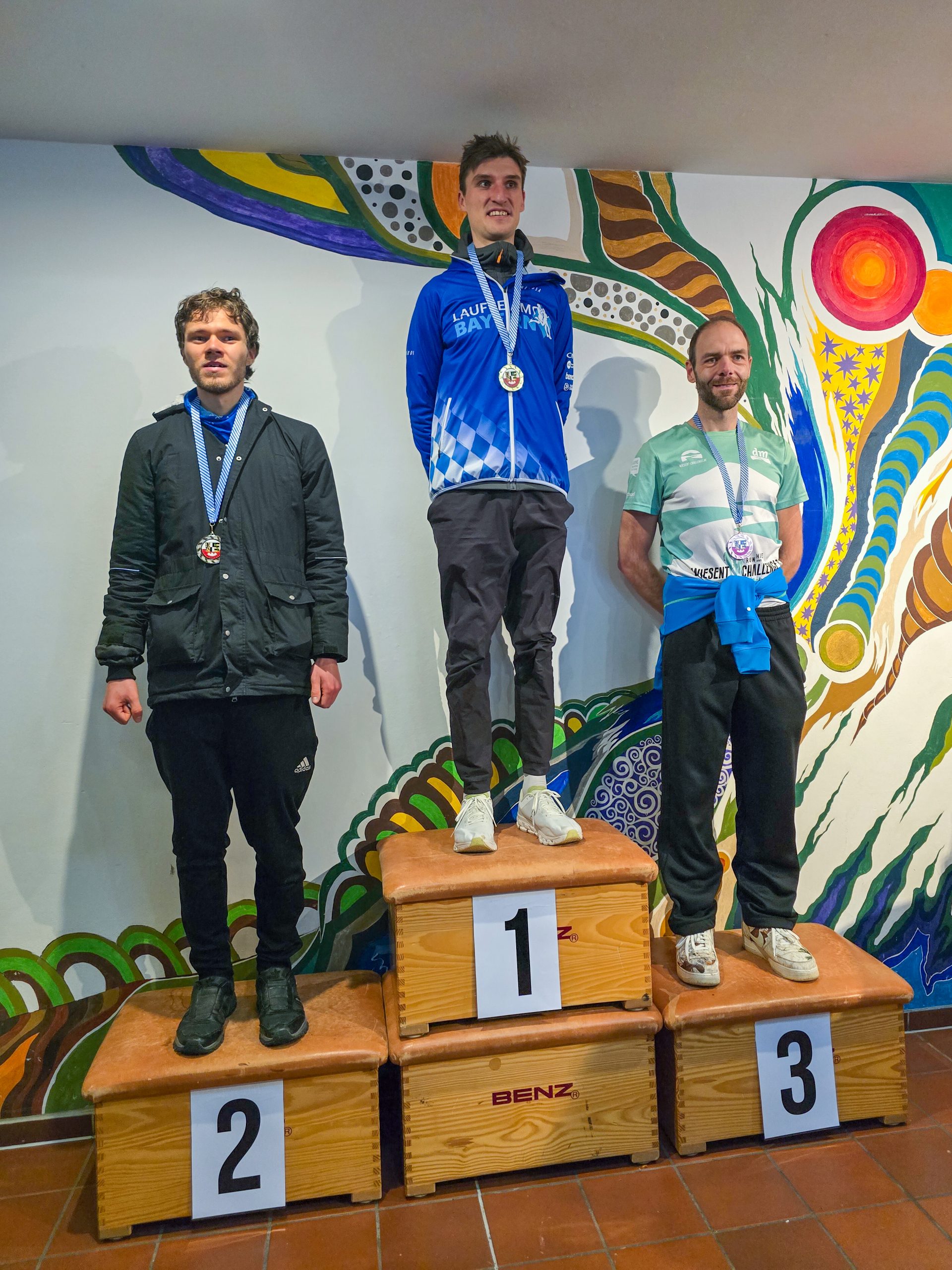 Die Strecke war gut laufbar, breite Waldwege boten keinerlei technische Schwierigkeiten. Anspruchsvoll war das ganze dennoch, steilere Passagen wechselten sich mit schnellen, flachen Abschnitten ab und verlangten ständige Tempoanpassungen. Ich kam gut voran und fand mich nach der Hälfte des Rennens auf Rang drei wieder. Ein letzter steilere Anstieg führte schließlich auf die Zielgerade. Diese letzten 1.300 Meter waren geprägt von einem sanften Anstieg, einer dünnen Restschneeauflage und dichten Nebel. Der Grip blieb gut, der Schnee beeinflusste das Rennen nicht und so hörte ich bald die Moderation des Zielsprechers, noch bevor ich das Ziel sah. Dies tauchte plötzlich aus dem Nebel auf und nach 19:41 überquerte ich die Ziellinie als Drittplatzierter.