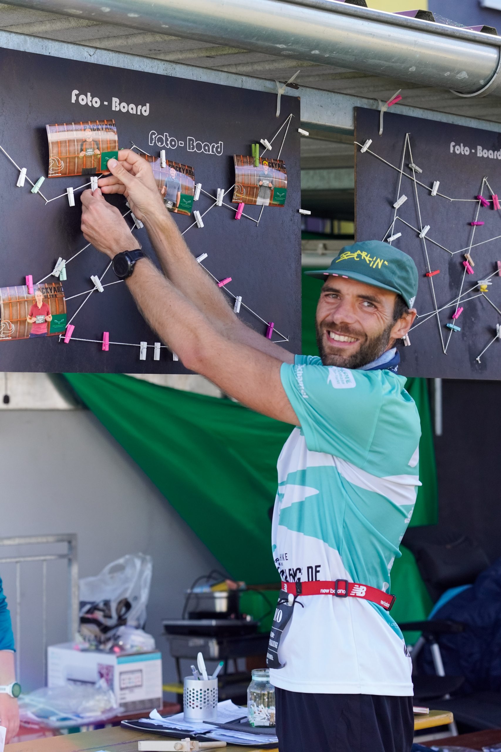 Für mich folgte das Ritual, an der DNF Glocke zu läuten und mein Foto von der Pinwand der Teilnehmer abzunehmen. Ein letztes Mal bediente ich mich am tollen Buffet und dann begann der Abbau unseres Lagers. Als Erinnerung bleibt das Foto und, sehr passend, eine Trillerpfeife als Medaille…